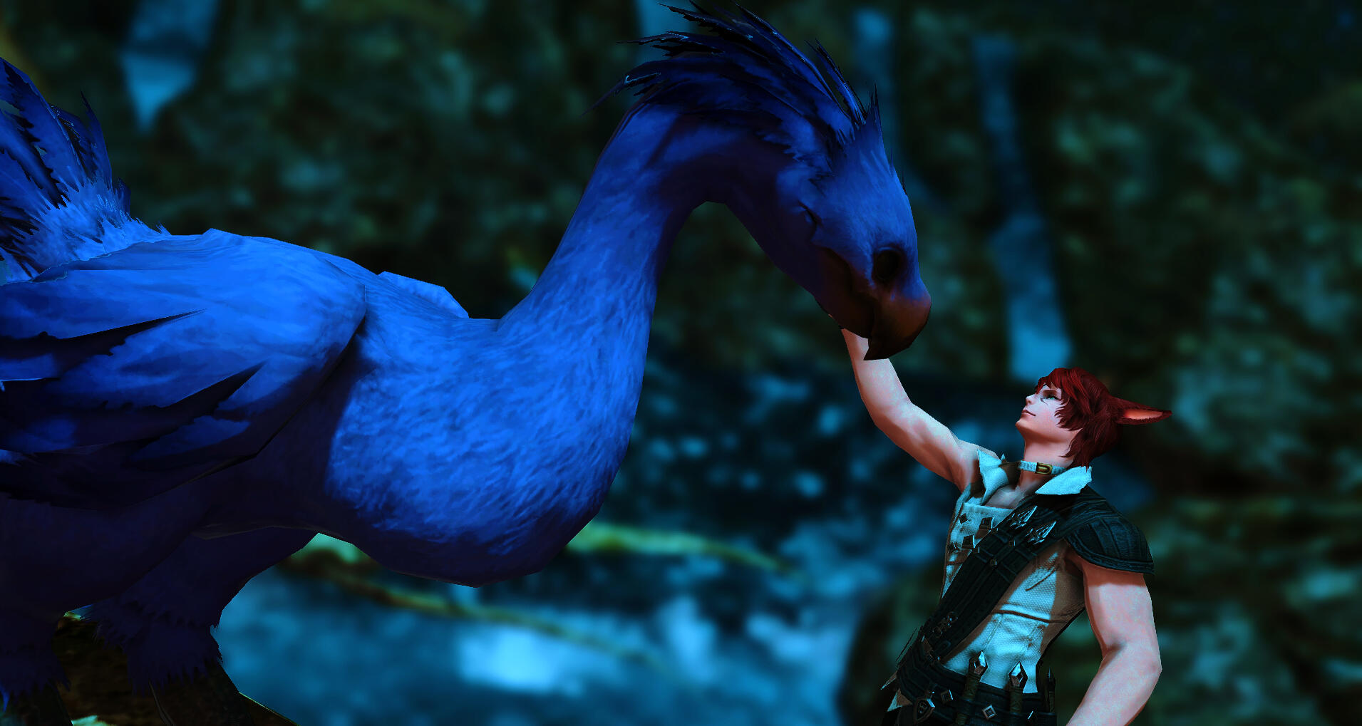 Raised since she was a chick, this feathery friend is never too far from her master's side. When Cheza was just barely a hatchling, she strayed too far from the stables of Central Shroud, being the curious little thing she was. A little too far from home, the young Chocobo was being pursued by hungry predators.Fortunately for her, the young Lucipher saw the stray chick during a hunting trip with Valerion and aided the stray Chocobo before things got grim.After escorting the young horse bird back to her mother, Valerion decided to pay the Chocobo Keeper a reasonable price believing it was high time Lucipher had his hands at raising a companion for the day he, too, would leave the nest of his home.As for her unusual purple color was due to her getting into Sh'elanoir's garden and eating the fruit she had been growing for months after obtaining the seeds during a shopping trip.Loyal and faithful Cheza is trained to follow specific commands given by Lucipher and will never flee from combat unless told otherwise.